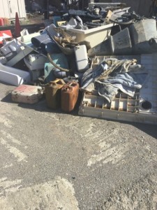 今回ご紹介させていただきます事例は、住宅などの水道設備などの工事をしている業者さんから排出された廃棄物です。ものは混合廃棄物です。お客様は現場から排出された廃棄物は今まで全て自社まで持ち帰り、敷地内の空きスペースにおいてためていたということでした。浴槽などの大きいものやトイレの便座、便器、洗面台など水回りに使用されている設備類が6立米から8立米くらいたまっている状態でした。積み込みするのは手作業では大変だと感じましたので、4tのヒアブ車、グラブ付きで引き取りに伺い、グラブで掴みながら積み込みをすることで素早く作業を終えることができました。今回のように大きいものや、重いもの、また車輌がつぐ脇にに停められる状況、そこそこの物量という場合についてはグラブでの積み込みをすることで、すばやい作業が可能になります。申し訳ないのですが作業中の写真はありませんが、今回置いてある写真をご覧になり、似たような状況であれば、一度で素早く回収することが可能です。
