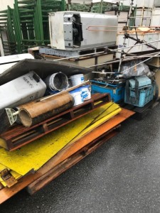 お客様は定期的に廃棄物を排出するというよりかは、一定期間ためて、片付けをするときに一気に排出するといったお客様で、今回御相談いただいた廃棄物も会社内の片付けによって排出されたもので、中身もいろいろなものが混ざっていました。プラスチック類、紙類、木くず類、ガラス類、金属類など様々です。中には冷蔵庫の廃家電リサイクル対象物もありました。下見させていただいたときは会社内のあちこちに廃棄物があり、あれも、これもといった状態でした。引取り時、あちこちにあったのでは時間がとてもかかってしまうので、事前に捨てるものは外のまとめておいてもらいようお願いをしました。おかげでフォークリフトをお借りしての作業でとてもスムーズに積み込みを行うことができました。
