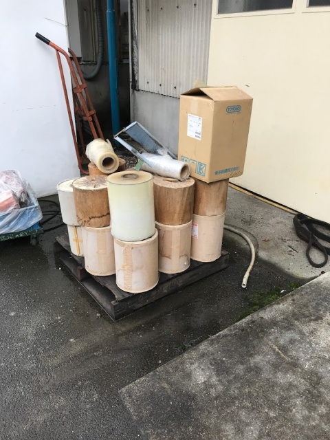 今回のお客様は普段、金属加工をしていて、加工くずなどのスクラップ類の排出がほとんどなのですが、今回の廃棄物はスポット的に排出されたもののようです。近くの知り合いの金属加工工場が高齢のため、工場を閉めるということで、そちらの工場にあった機械をお客様の工場へ移設するという話になったそうで、その機械を入れるスペースを作るために工場内の片付けをしたそうです。不要な機械類の排出が済んだら工場内の奥に廃棄物類も出てきたということでした。その中に今回ご紹介の廃プラスチックも出てきたそうです。フィルムのロールで3個くらいありました。破砕処理場ではロール物は絡まってしまったり、転がって延びてしまったりということもあり、処理困難物に該当することが多いです。お付き合いの処理場でも前処理をした上で破砕するということで、別単価で受けて貰えました。