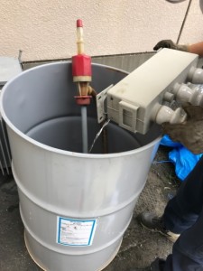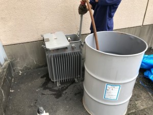 引き取りは筐体そのままするのではなく、現場で中の廃油を抜き取ってドラム缶に移して、廃油、金属くずそれぞれで運搬を行いました。変圧器、コンデンサはお客様が事前に取り外しをしてくれていたので、当社はポンプとインパクトドライバー、ドリル、ウエスなどを持参して現場で作業をさせていただきました。無事、中の廃油をドラム缶に移し替えてそれぞれで処理をすることができました。